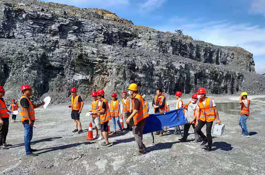 此次演練以暴雨后作業(yè)人員在露天礦山進行采裝作業(yè)時,臺階發(fā)生坍塌為背景,共有演練動員準備、發(fā)現(xiàn)險情疏散、搶險和現(xiàn)場急救四個環(huán)節(jié)。