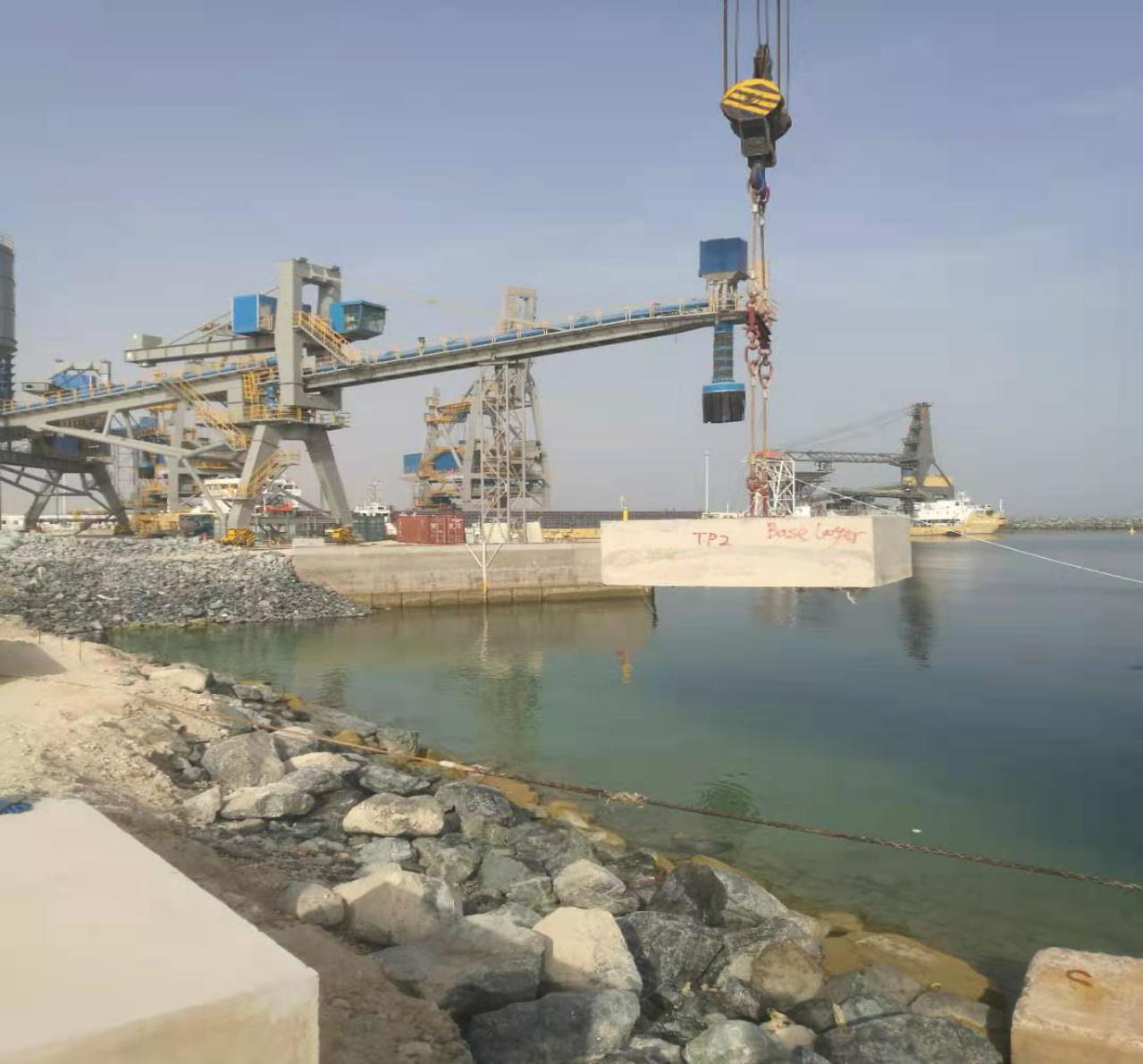 該項(xiàng)目是中東首個(gè)清潔燃煤電站,是習(xí)近平總書記在阿聯(lián)酋《聯(lián)邦報(bào)》、《國民報(bào)》發(fā)表題為《攜手前行,共創(chuàng)未來》的署名文章里提及的項(xiàng)目,作為絲路基金在中東的首單投資,在國家“一帶一路”的戰(zhàn)略中具有重要的里程碑意義。在取排水工程項(xiàng)目分項(xiàng)中,招港國際公司主要負(fù)責(zé)工作船碼頭、內(nèi)護(hù)岸、東防波堤施工以及臨時(shí)碼頭拆除、取水戽頭、排水?dāng)U散頭維修等施工工作。